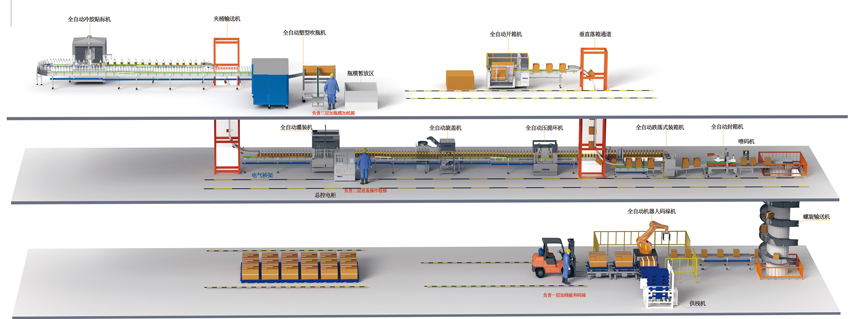 生產線設備組成:三樓:全自動開箱機、落箱機、全自動塑型吹瓶機、全自動回轉式貼標機
